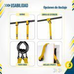 • Diseño ergonómico y ajustable: Las bandas de suspensión están diseñadas para ajustarse a diferentes alturas y niveles de dificultad, permitiendo que adaptes el entrenamiento a tu capacidad y progreso físico.