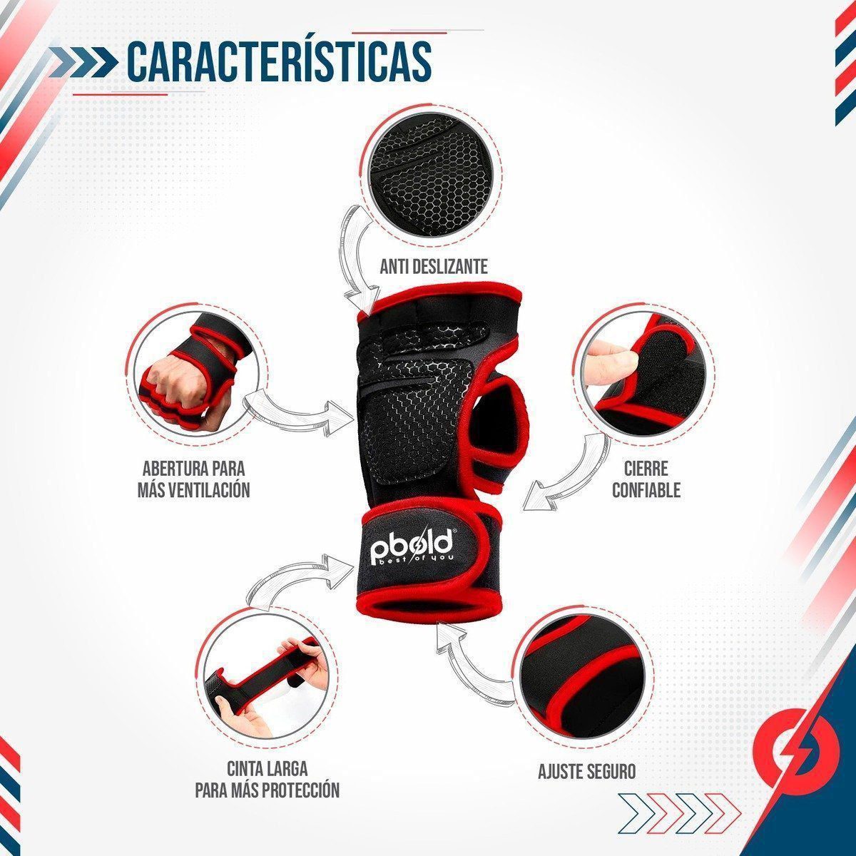 • Agarre mejorado: Las palmas están reforzadas con una textura antideslizante que mejora el agarre y la seguridad durante levantamientos de pesas, dominadas y ejercicios de CrossFit.